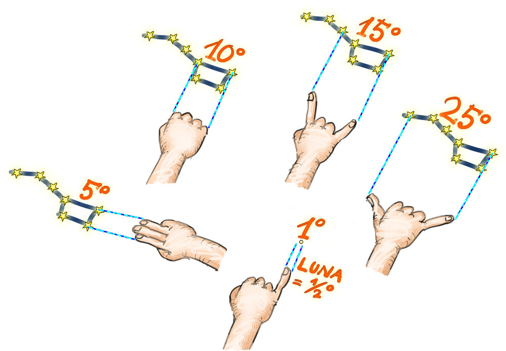 Kote lahko približno ocenimo z iztegnjeno roko, prsti in dlanjo, kar pri astronomskih opazovanjih pogosto pride prav.